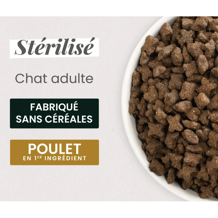 Cette recette contient près de 60% d'ingrédients d'origine animale pour respecter le régime carnivore de votre chat et lui offrir une alimentation en accord avec ses vrais besoins.