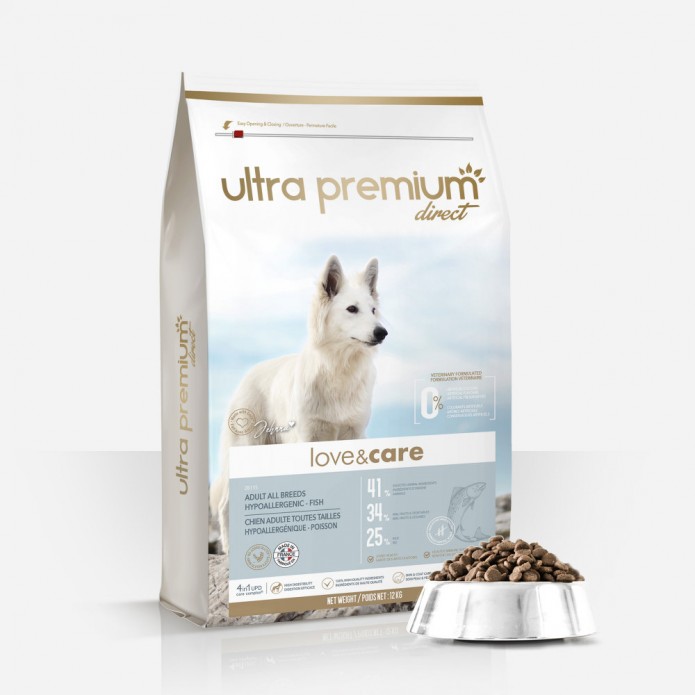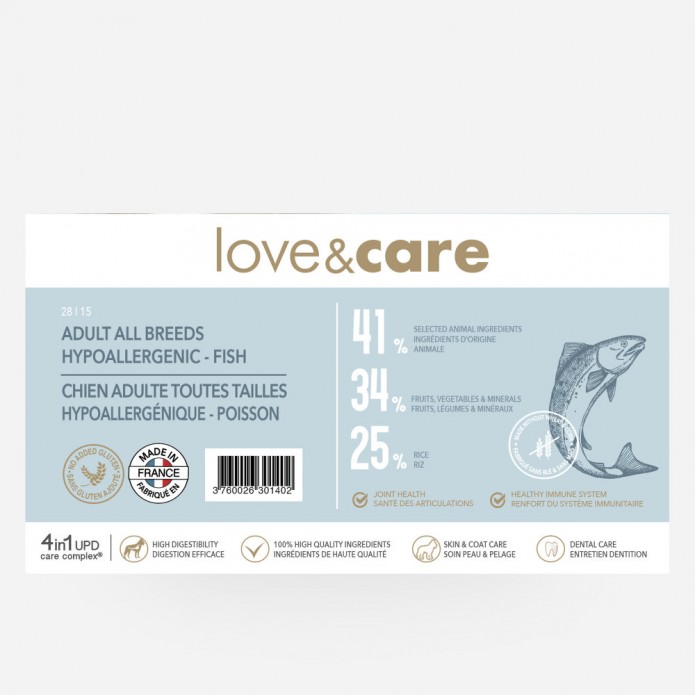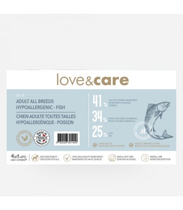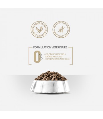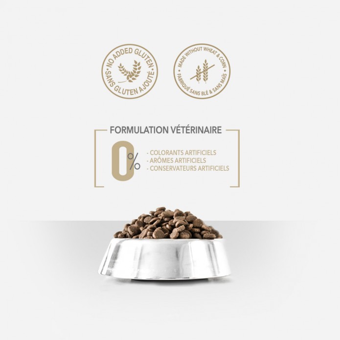 poissons déshydratés (29%), riz (25%), pois (15%), graisse de poulet (10%), levure de bière (4%), cosse de caroube (3%), tapioca (3%), pulpe de betterave (2%), huile de saumon (1,5%), vitamines et minéraux, extrait de levure Saccharomyces cerevisiae (source de MOS et de β-glucanes), ascophyllum nodosum, inuline (FOS), huiles essentielles (origan, cannelle, girofle, thym), chlorhydrate de glucosamine, sulfate de chondroïtine, yucca schidigera.