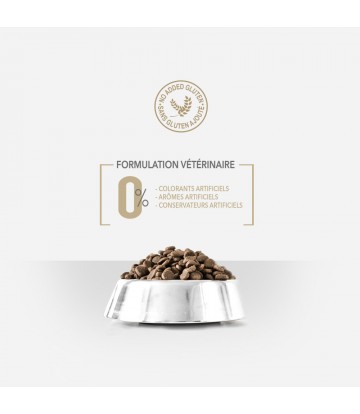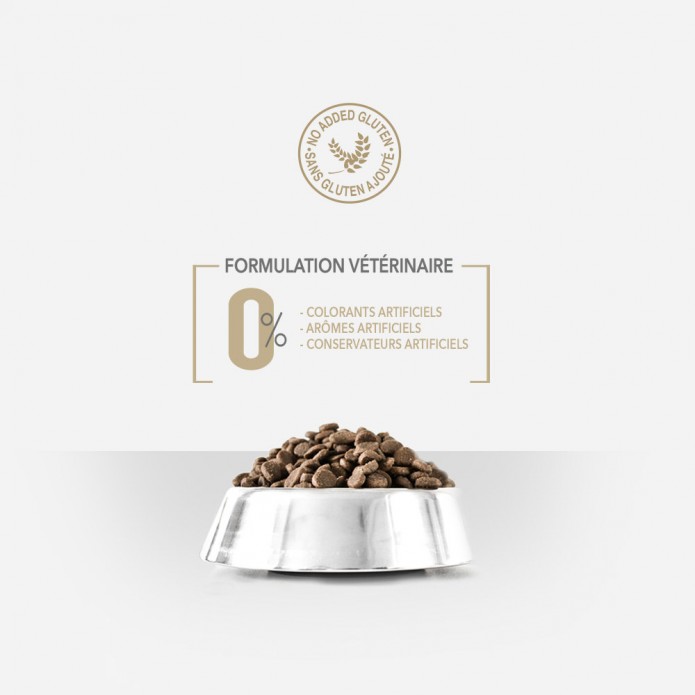 COMPOSITION : poulet déshydraté (31%), riz (20%), pois (16%), graisse de poulet (13,5%), maïs (10%), poisson déshydraté (2%), cosse de caroube (2%), huile de saumon (1,5% dont 5% DHA), pulpe de betterave (1,5%), œufs déshydratés (1%), levure de bière, chlorure de sodium, fructo et manno-oligosaccharides, ascophyllum nodosum, plantes (thym, fleur de camomille, fenouil, échinacée), yucca schidigera.