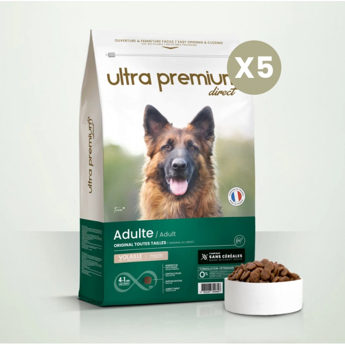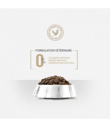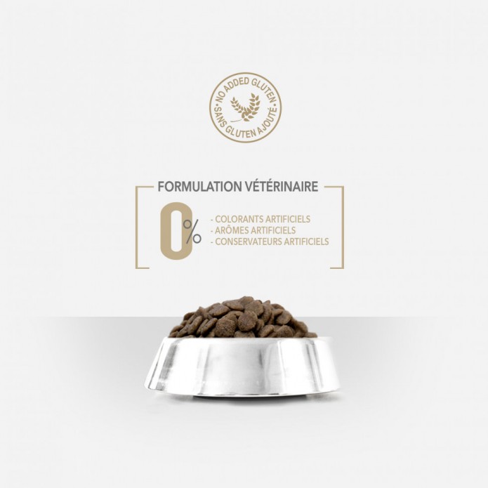 COMPOSITION : volaille déshydratée (30%), graisse de poulet (13%), pois (12%), porc déshydraté (11%), poisson déshydraté (10%), fécule de pomme de terre (7%), tapioca (7%), cosse de caroube (2,5%), huile de saumon (1,5% dont 5% DHA), levure de bière (1,2%), œuf déshydraté (1,2%), pulpe de betterave (1%), graine de lin (1%), luzerne, chlorure de sodium, fructo et manno-oligosaccharides, sulfate de chondroïtine et glucosamine, ascophyllum nodosum, plantes (thym, fleur de camomille, fenouil, échinacée), lécithines.
