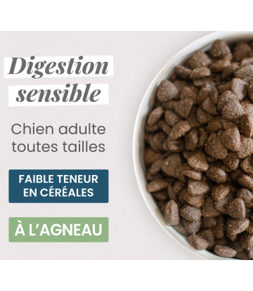 Les problèmes de digestion chez le chien peuvent provoquer un poil terne, des pertes de poids ou une difficile absorption de la nourriture. Cette recette est conseillée pour répondre aux besoins des chiens présentant des sensibilités digestives ou des intolérances. L'agneau est une excellente source de protéines.