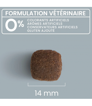 De formulation vétérinaire, nos croquettes Light Care contiennent moins de matières grasses et ont une teneur en fibres végétales plus élevée que nos croquettes pour chiens adultes « classiques » : elles sont idéales pour limiter la prise de poids de votre chien. Les fibres vont contribuer à augmenter la sensation de satiété et agiront également positivement sur le transit. La teneur en protéines animales est élevée, les ingrédients d'origine animale sont toujours en première position dans nos recettes afin de répondre aux besoins de votre chien et éviter la fonte de sa masse musculaire.
