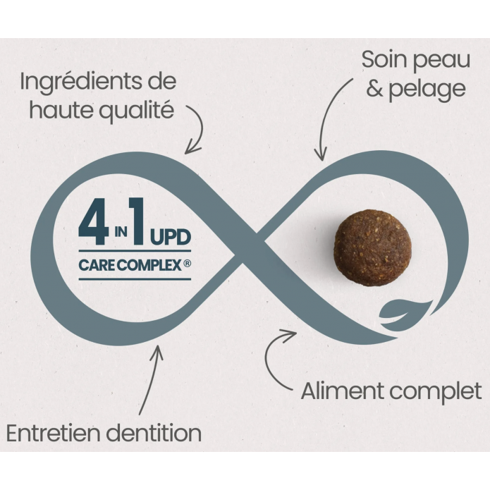 protéines de poulet déshydratées (16%), creton déshydraté (100% porc) (16%), riz (16%), pois déshydratés (12%), maïs (10%), pomme de terre déshydratée (7%), graisse de volaille (6%), protéines de volaille hydrolysées, pulpe de betterave déshydratée, pulpe de chicorée déshydratée (source de FOS) (3%), huile de poisson, fibres végétales, minéraux, huile de saumon (1,5%), levures, glucosamine (1000 mg/kg), sulfate de chondroïtine (1000 mg/kg), mannan-oligosaccharides (MOS) (0,1%), ascophyllum nodosum déshydratée (0,1%), pulpe d’olive déshydratée (source de polyphénols) (0,1%), plantes déshydratées (curcuma, romarin, girofle).