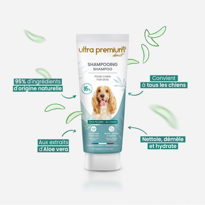 Notre shampooing offre une action nettoyante, démêlante et hydratante. Composé à 95% d’ingrédients d’origine naturelle, il respecte la sensibilité de la peau de votre chien. Les ingrédients sont sélectionnés avec soin pour leurs nombreuses vertus, avec des extraits d’Aloe vera pour aider à l’hydratation. Il contient également des extraits de graines de coton pour contribuer à nourrir et à apaiser la peau de votre chien. Il est donc parfaitement adapté aux peaux les plus sensibles !