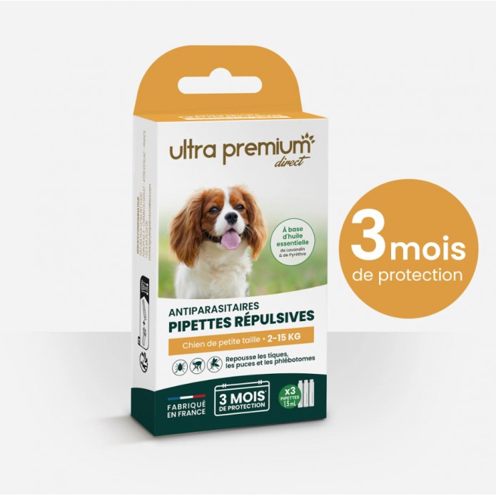Les pipettes répulsives antiparasitaires Ultra Premium Direct offrent à votre chien de petite taille (2-15 kg) une protection efficace contre les puces, les tiques et les moustiques grâce à l'huile essentielle de lavandin et de pyrèthre. Elles respectent la sensibilité de votre chien et le protègent jour après jour.