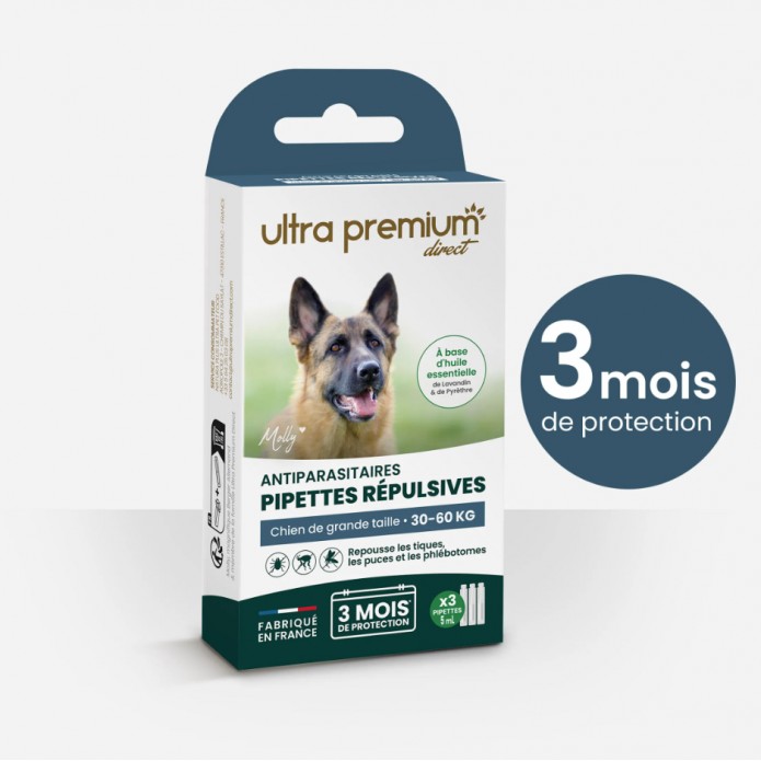 Nos antiparasitaires pour chien ont un format pratique, pour une application facile sur la peau de votre animal. Chaque pipette offre une protection efficace durant 1 mois pour un chien de grande taille (30 - 60 kg). Avec notre pack d’antiparasitaires, votre chien bénéficie de 3 mois de protection.